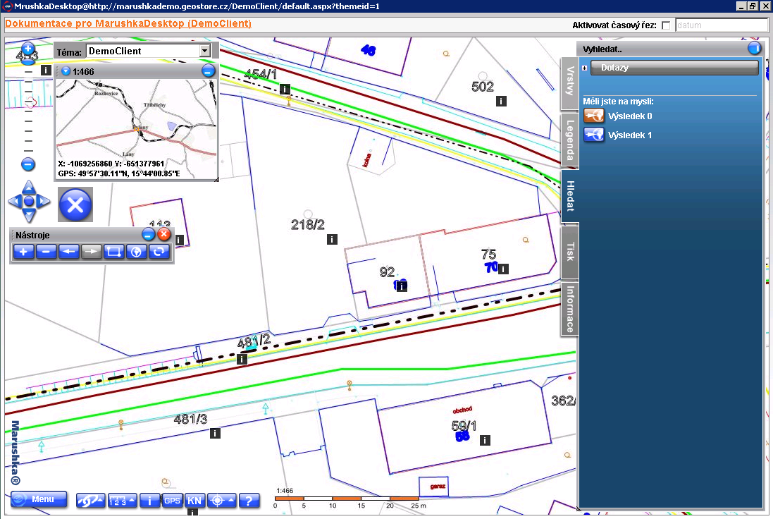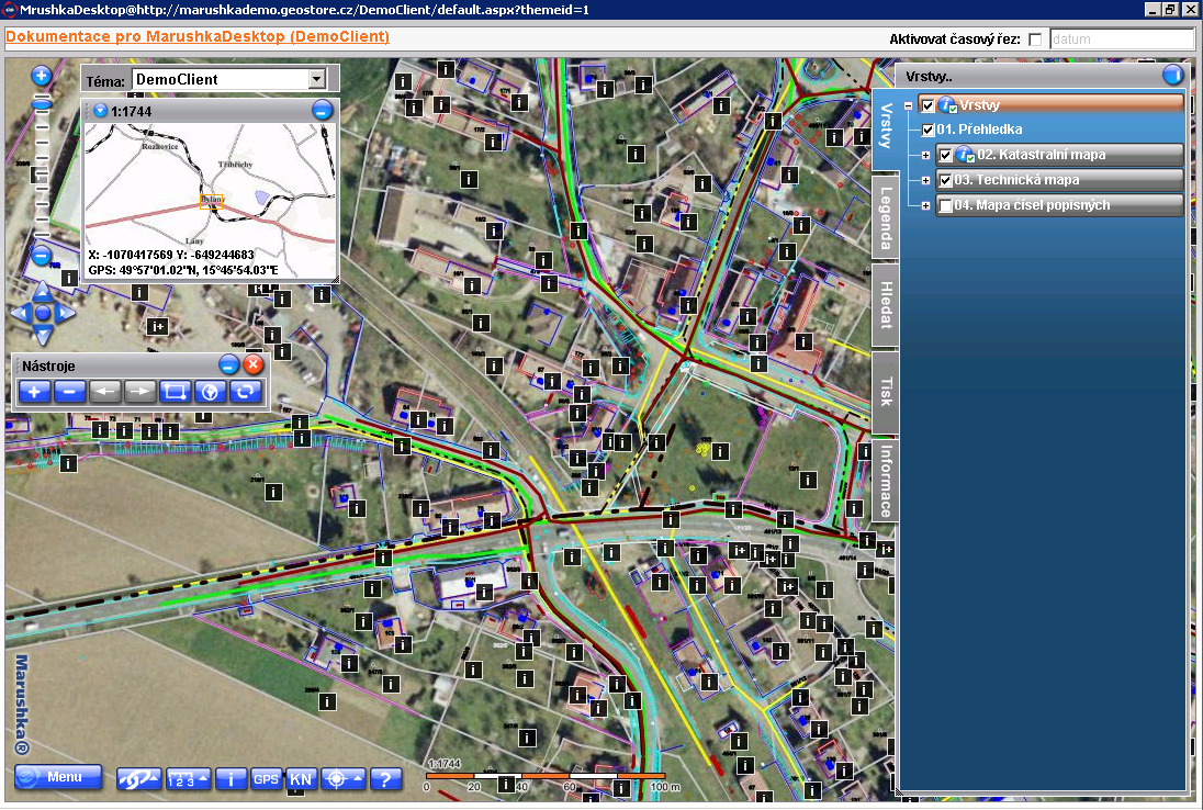 Před vlastním volání akcí pro práci s mapou je třeba mapu otevřít. To provedete volbou z menu Mapa > Otevřít mapu. Pokud volba není dostupná, tak nemáte nastavenou vazbu na GIS, nebo došlo k chybě při inicializaci. Mapa se otevře jako nové okno MarushkaDesktop.