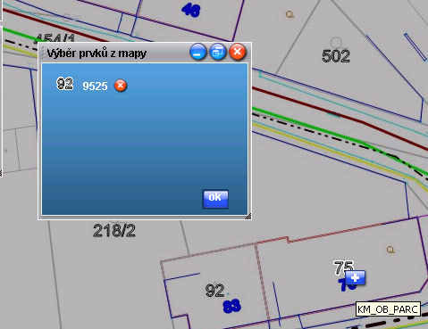 Po kliknutí na parcelu v mapě se u ní zobrazí ikonka „plus“, po jejímž stisknutí se vybrané parcela zařadí do okna „Výběr prvků z mapy“. Výběr parcel dokončíte kliknutím na tlačítko „ok“ v tomto oknu se seznamem parcel.